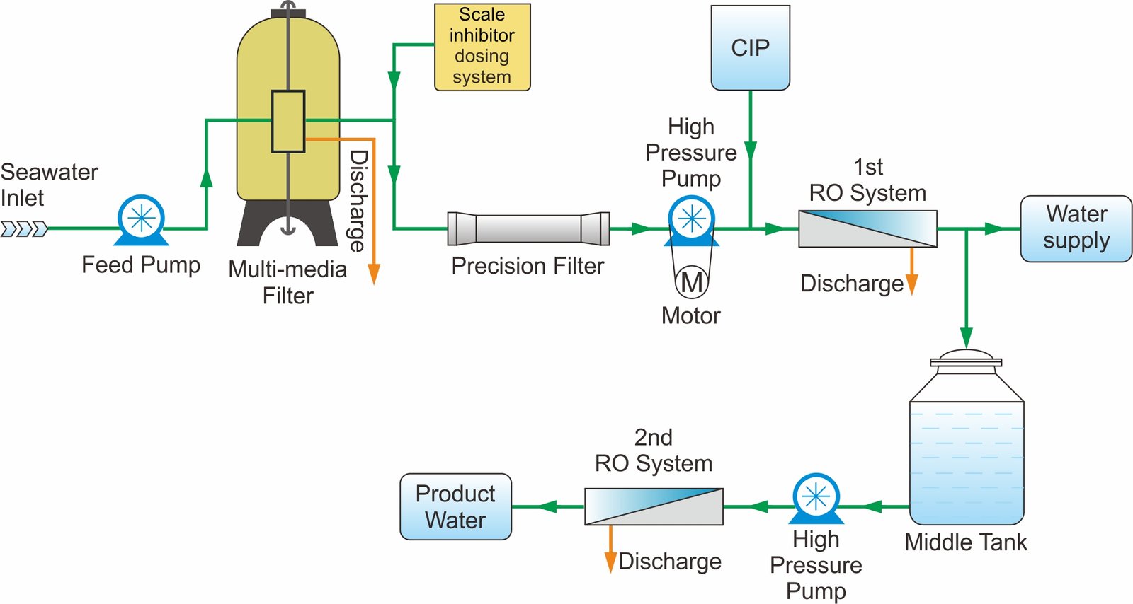 The Container Type Double RO Seawater Desalination System (1st RO 144 tons, 2nd RO 10 tons) adopts the international advanced reverse osmosis technology and is designed by optimizing the system.